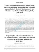 Vai trò của cán bộ lãnh đạo địa phương trong một Can thiệp cộng đồng nhằm tăng cường áp dụng kiến thức vào thực hành chăm sóc sức khỏe trẻ sơ sinh (NeoKIP) tại Quảng Ninh, 2008 - 2011 / Dương Minh Đức, Bùi Thị Thu Hà // Tạp chí Y tế công cộng, 2015, tháng 6.- Số 36.- Tr.48 - 54.- 7Tr..